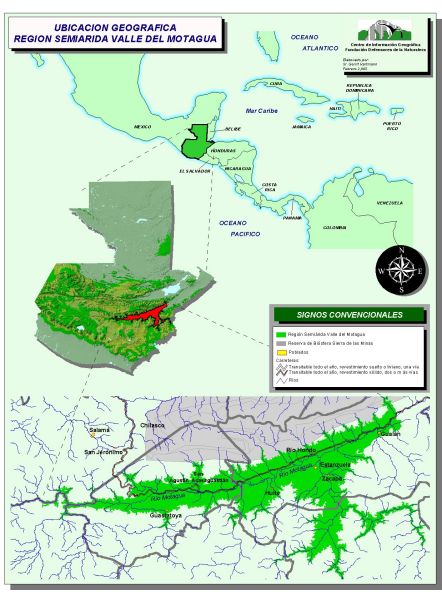 La región semiárida del valle del Motagua, se encuentra en el nororiente de Guatemala, en los departamentos de El Progreso, Zacapa y Chiquimula, y contiene dos zonas de vida: monte espinoso subtropical y bosque seco subtropical (The Nature Conservancy -TNC- & Fundación Defensores de la Naturaleza -FDN- 2003). La figura 1 muestra la localización del área.Figura 1: Ubicación geográfica de la región semiárida del valle del Motagua, Guatemala