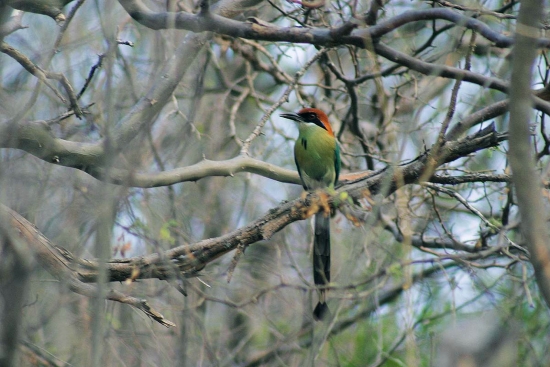 Para la región semiárida del valle del Motagua, se reportan 48 especies de mamíferos y 101 especies de aves (Valle et al. 2003), algunas de las cuales hacen uso del bosque de galería para proveerse de sitios de reproducción y alimento (TNC & FDN 2003). En cuanto a las aves, las familias Columbidae, Tyrannidae, Icteridade y Fringilidae, son suficientemente abundantes como para ser consideras características de la región (Land 1970). Vale la pena mencionar también que este valle es el único sitio donde se localiza al Momotus mexicanus en Centroamérica (Russet Crowned Motmot), y que a esta especie podría considerársele, entre otras, como indicadora de buena calidad de hábitat (Figura 4). Sin embargo, los estudios de aves realizados en esta zona recientemente (Pérez 2003; Nájera 2004), muestran que la mayoría de especies de aves registradas en el valle son generalistas y poco sensibles a la perturbación del hábitat.Figura 4. El valle del Motagua es el único sitio de distribución del Momutus mexicanus en Centroamérica