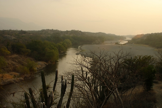 Así mismo, en el valle del Motagua, existen varias especies endémicas y amenazadas, pero este ecosistema se encuentra muy amenazado por el avance de la frontera agrícola y apenas representado en el Sistema Guatemalteco de Áreas Protegidas, por lo que se hace más urgente el emprender acciones que aseguren su protección y permanencia a largo plazo. En la Figura 5, se muestra una vista de este particular ecosisistema, atravesado por el Río Motagua.Figura 5. La región semiárida del valle del Motagua, a pesar de su importancia y singularidad, se encuentra muy amenazada y muy poco representada en el sistema guatemalteco de áreas protegidas