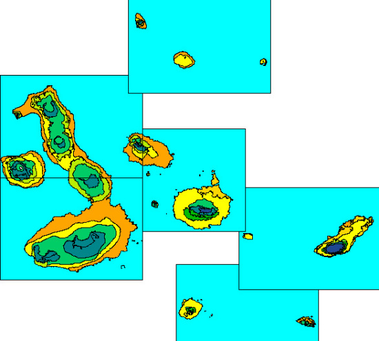 Figure 1. Dry Zone (yellows and oranges), Transition Zone (greens) and Humid Zone (blues) of the central Galapagos archipelago; High-altitude Dry Zone not distinguished on this map. Ecological zone map of PRONAREG et al. (1987).