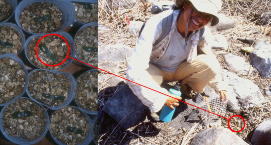 Figure 10. Research student Vanessa Coronel with Opuntia megasperma seedlings planted in the field on Española Island.