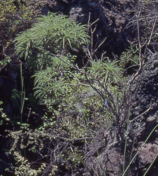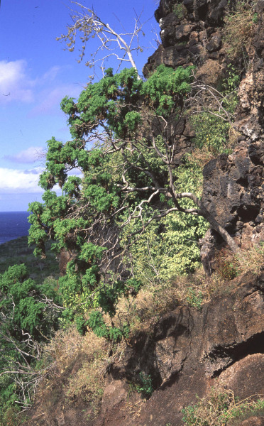For example on Española, photographs taken in 1905-6 by the California Academy of Sciences in various parts of the island demonstrate the state of the vegetation shortly after the introduction of goats, while transect comparisons between Española and its offshore islet Gardner (which never harboured goats) show that the state attained on the main island 20 years after goat eradication is comparable with that of a nearby area unaffected by goats. On Santa Fe, the species-focused studies of Hamann showed that Scalesia helleri (Fig. 7) and Opuntia echios, which had been badly affected by the goats, regenerated more or less rapidly following eradication of the animals.