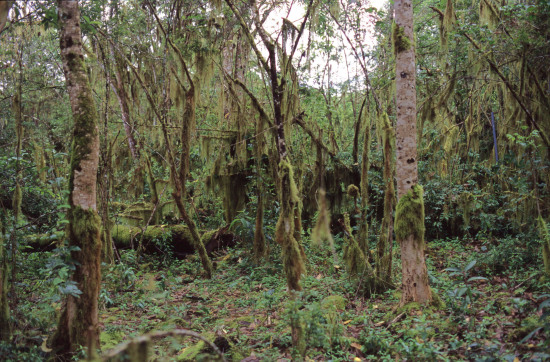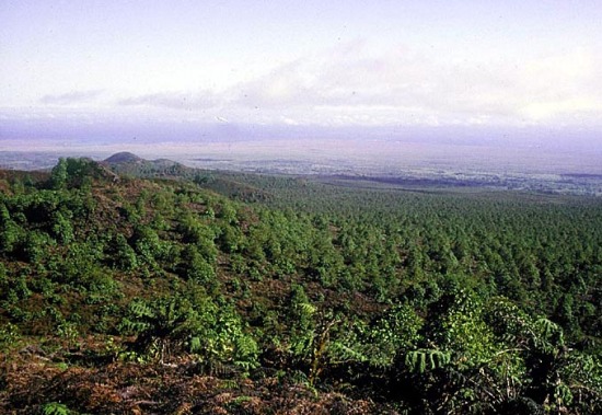 Figure 3a. Effects of competition (invasion of the tree Cinchona pubescens) in the naturally treeless highlands of Santa Cruz Island: photo H. Jäger).