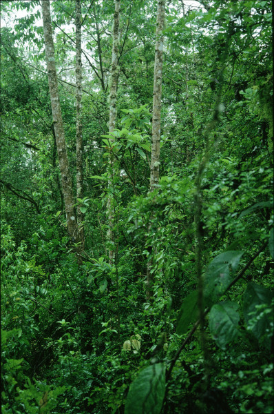 Figure 4a. Replacement of Transition Zone Scalesia pedunculata forest by introduced Cedrela odorata and Psidium guajava. 1992. Photos: O. Hamann.