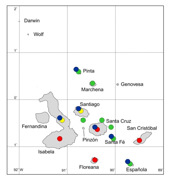 Figure 6. Galapagos islands to which goats have been introduced and gone wild. Red circles = not yet eradicated; green = already eradicated; yellow = eradication in progress (as at end of 2005); blue = long-term vegetation monitoring projects in place.